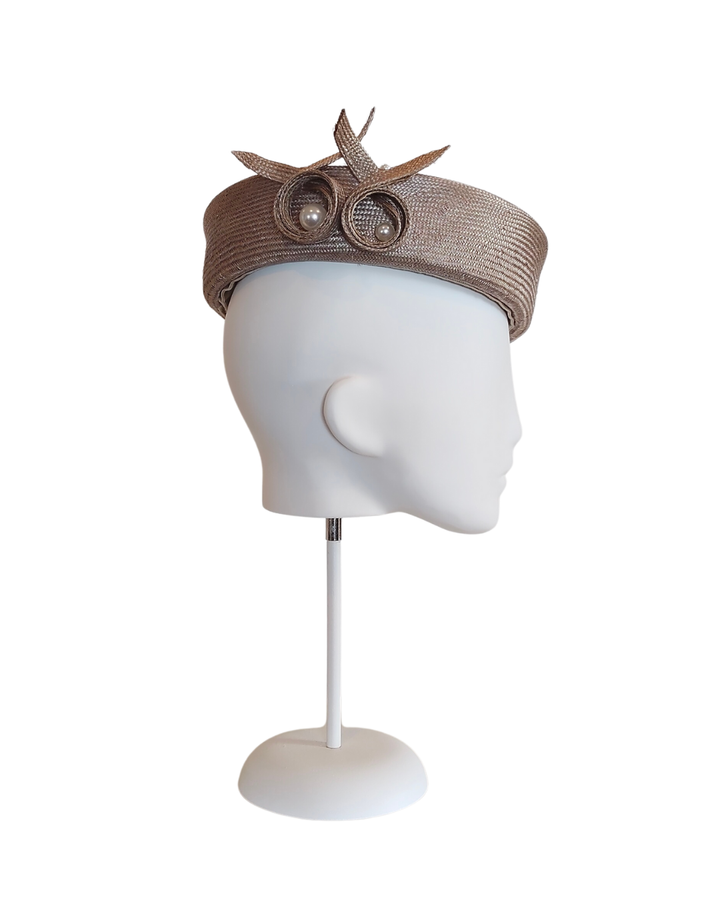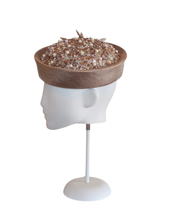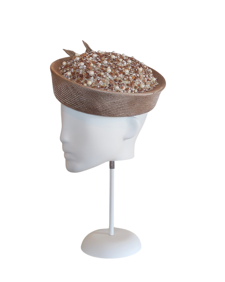 "Le Biege" Parasisal Straw Sailor Beret in Taupe Embellished with Beaded Sequin & Pearl Fabric
